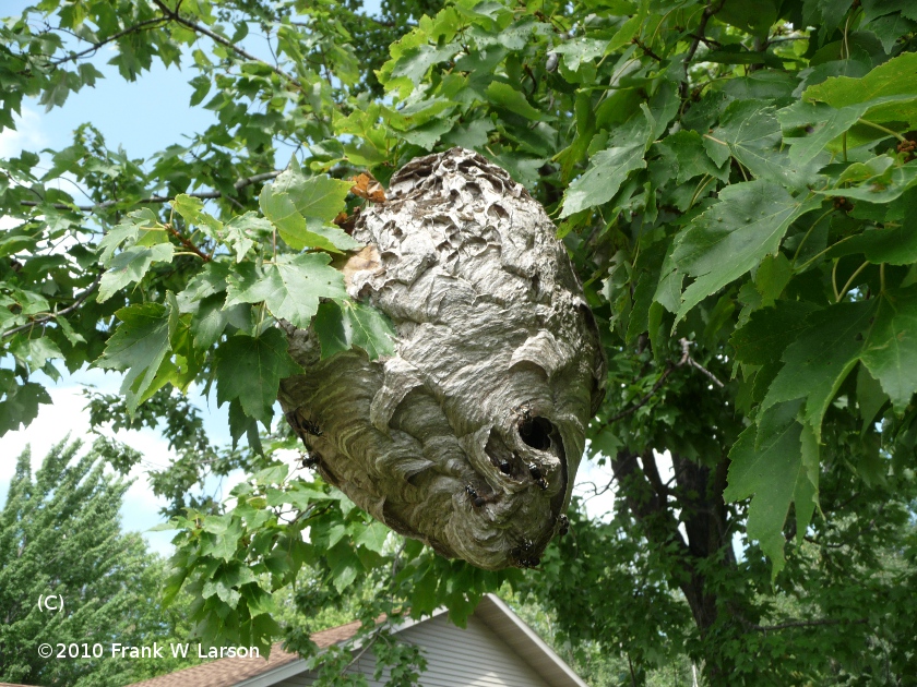 Frank: On 08/28/2010 I photographed this paper wasp nest in our yard. It is six feet off the ground in the red maple adjacent to the deck. Photo (A) is the west side looking a little rough yet. Photo (B) is the west side one hour later with finishing touches completed. Photo (C) shows the entrance on the east side of the paper wasp nest. I don't know how long it took the wasps to complete the nest, but it was definitely less than six days. I hope the woodpeckers don't tear it apart this Fall. It will make a nice specimen nest.